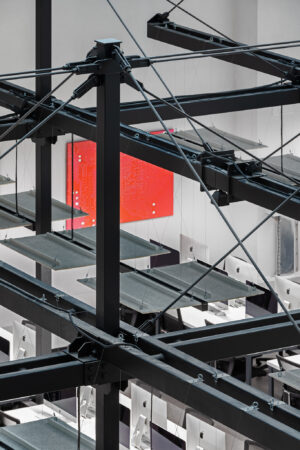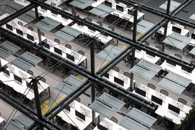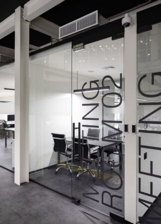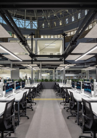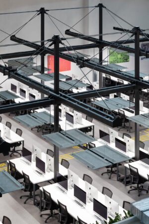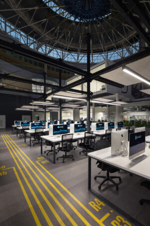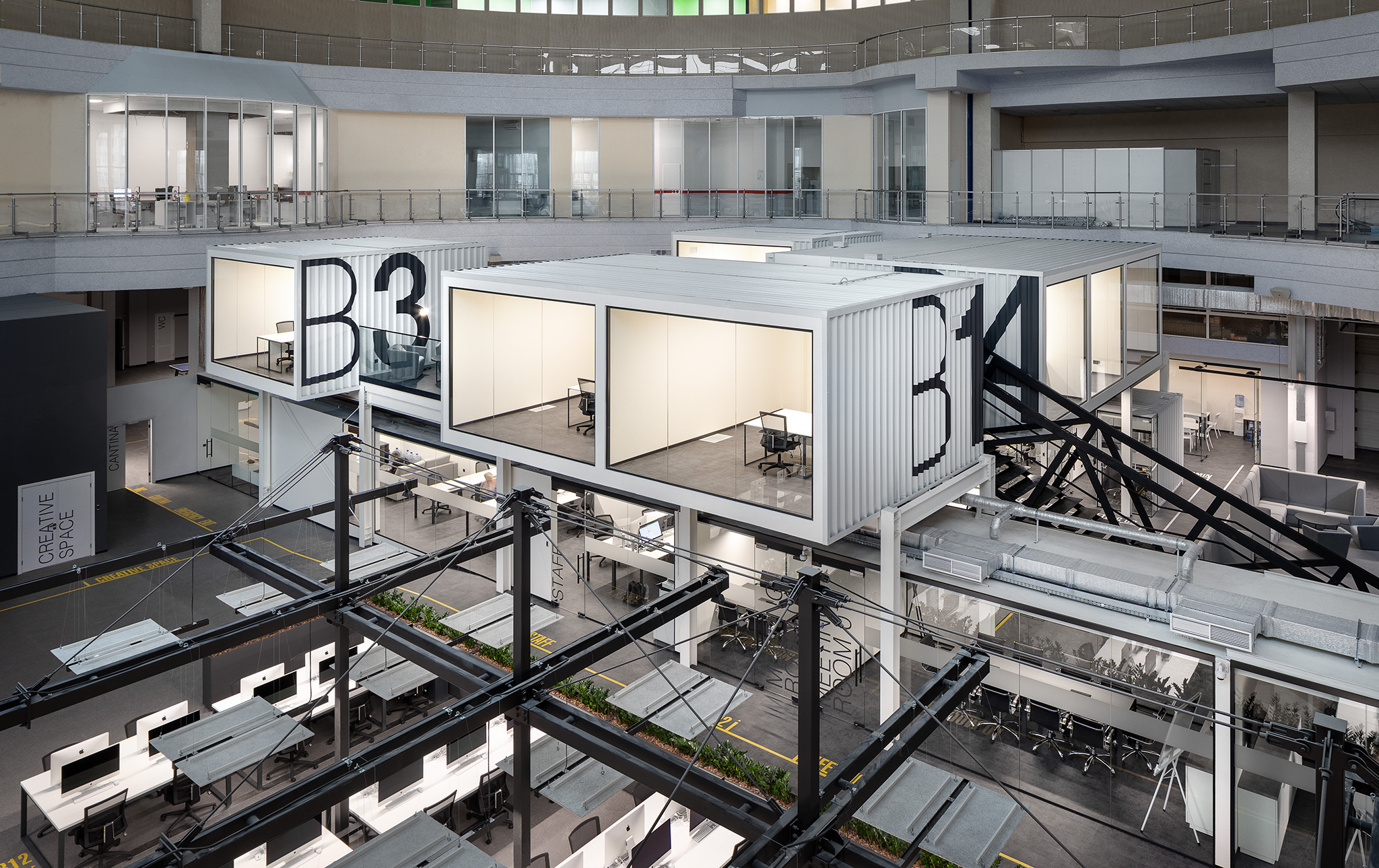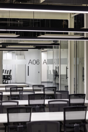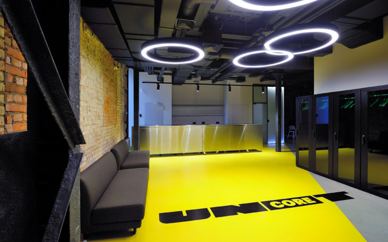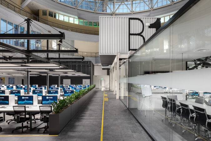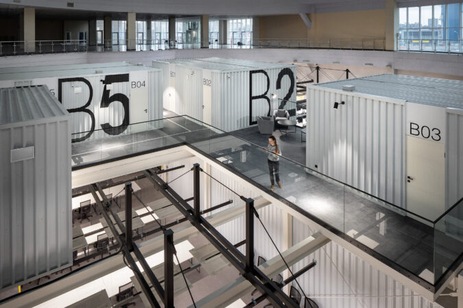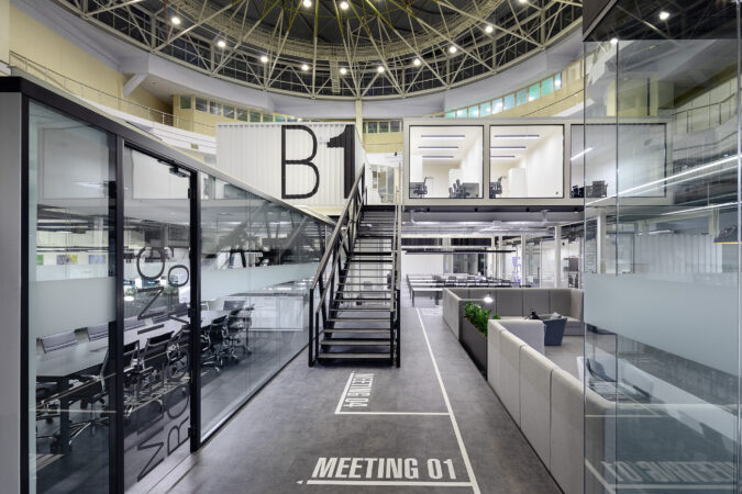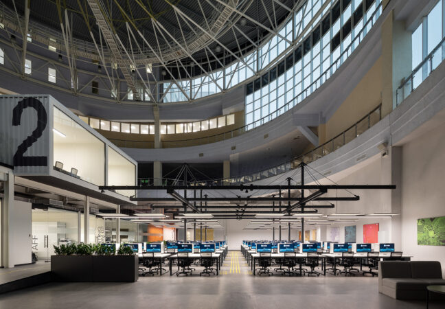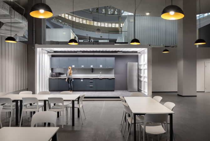 The project consists of two parts. The first is an innovative IT school, which includes: a training cluster for 122 training stations equipped with modern computers and the ability to host an additional 44 training stations, presentation rooms, a game and lounge areas, and kitchens. The second part is a modern coworking, located on two floors. These are 16 club offices for 2, 4, 6 workplaces, or 64 workplaces in the common room – 58 unsecured workstations, meeting rooms, a modern conference room with 46 seats, lounge areas, a kitchen and showers. The total space is zoned not only in the horizontal plane, but also vertically. So, part of the club’s offices are boxes with glass display cases that are raised to the second level due to a metal platform. Lounge zones and meeting rooms also appeared here, from which a view of the educational process in the IT school and the lounge zone of coworking opens. Club offices on the ground floor are partially implemented from containers.