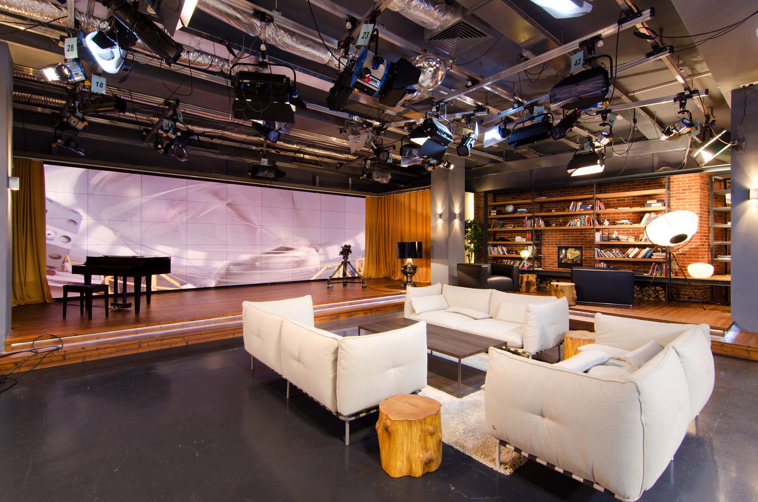 The new studio TVi channel must be a part of the renovation of the channel. It was conceived initially as a cozy apartment with a democratic design, where different people come for chatting, drinking tea, etc. Starting from requirement specification (six different functional areas), we have: kitchen area, the center – the living room, the podium scene, area libraries, talks and cabinet area. The kitchen turned out homely, with a large island, wooden chairs for sitting and wooden open shelves above the work surface, which were made by special order. In other areas there are also exclusive wooden elements: a large round table in the living room, legs that are welded from metal (code-named “antitank-hedgehog”), the shelves in the library with a fireplace that flow smoothly into the table for the news, decorative wooden wall, podium, hemp – coffee tables, benches for visitors. The space of the studio-apartment turned transforming as intended. It successfully used for filming TV-programs and shows, using different schemes of arrangement of furniture.